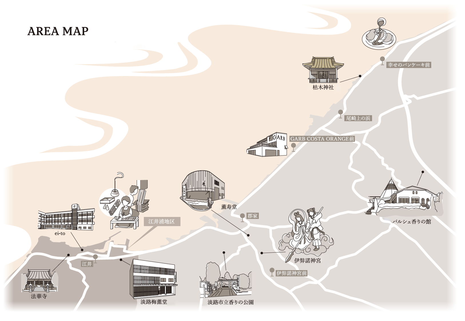 その昔は港を取り囲むように廻船問屋が⽴ち並び、「淡路の富の七割が江井にある」とまでうたわれた繁栄の名残が、町に⾊濃く残っています。厳しい季節⾵のため、冬に仕事を失う船乗りたちの、冬枯れ対策として⽣まれた淡路島の線⾹産業。今では廻船問屋に取って変わり、多くの線⾹⼯場が軒を並べています。そこかしこから漂う線⾹と、潮⾵が織りなす独特の⾹りから、地区の歴史をうかがい知れます。
