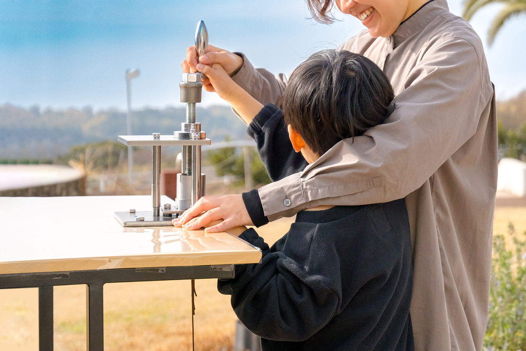 使う機械も特別です。淡路島の洲本実業高校の生徒さんたちが約2年かけて作った手回しの機械で、高さ調整もでき、小さなお子さんも一緒に楽しめます。